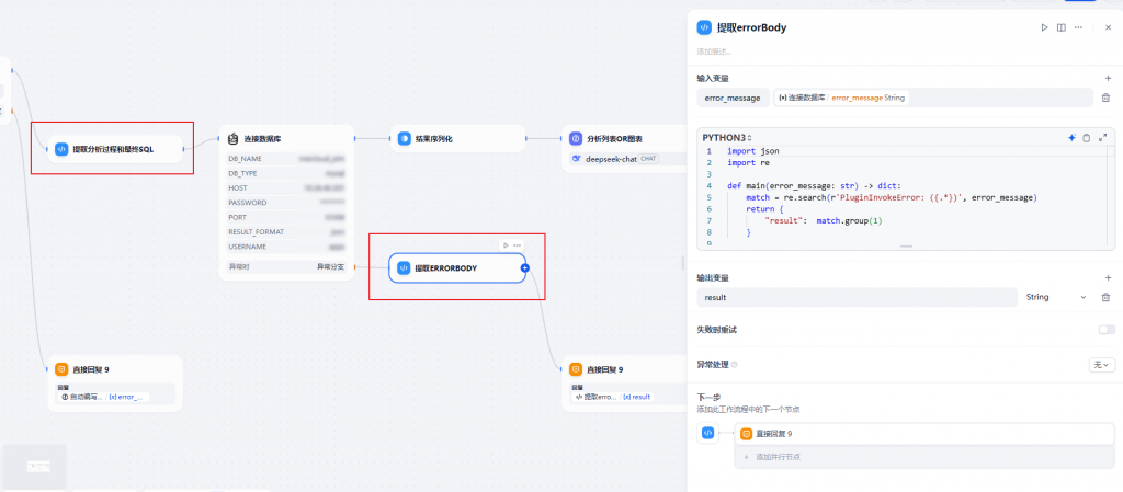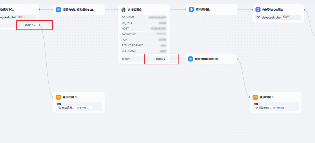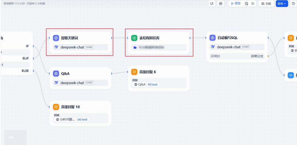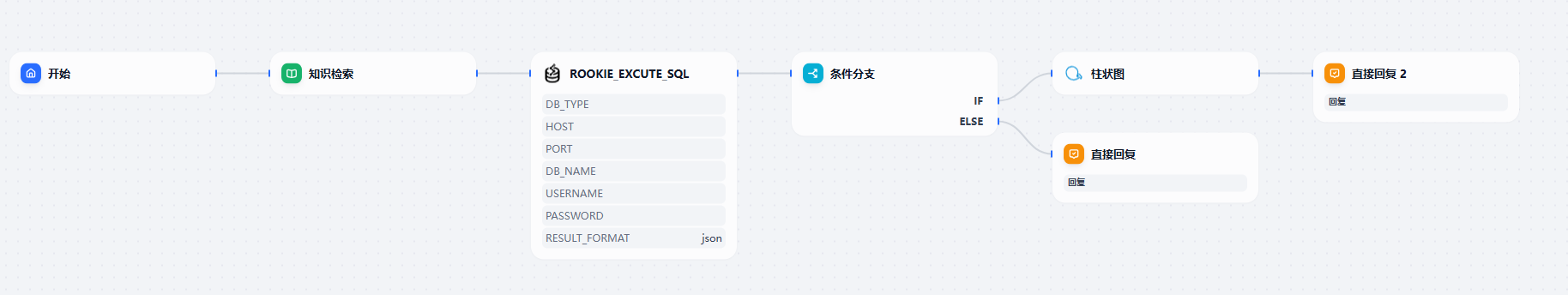 实际调试下来, 需要增加很多的优化节点才能保证有一个比较高的准确性, 上图是花了近一天时间调试下来的效果, 而且还没有足够完善, 比如数据库查询这一个环节, 有几率会出现生成的SQL无法执行, 需要增加重试机制(不是简单的重新执行, 而是把错误结果作为BuildSQL的一部分进行重试)